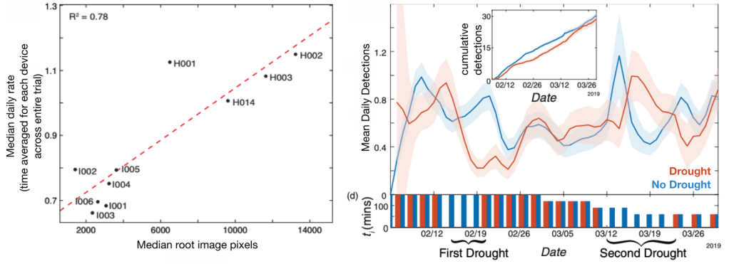 The RootTracker offered novel underground visibility root growth dynamics. Through manual analysis of numerous large field trials, I was able to not only continually refine the algorithm, but extract useful biological insights through root detection statistics that paired with experimental information such as seed treatment, genotype and irrigation information and communicate these findings to stakeholders such as clients and company leadership. In one study spanning three trials each containing over 1000 devices (study published here, one trial of which I directly oversaw in Rancagua, Chile), we were able uncover genotype specific responses to abiotic stress, whereby plants would later produce deeper roots in response to an imposed drought. We were also able to validate the accuracy of the technology through root excavation and imaging.